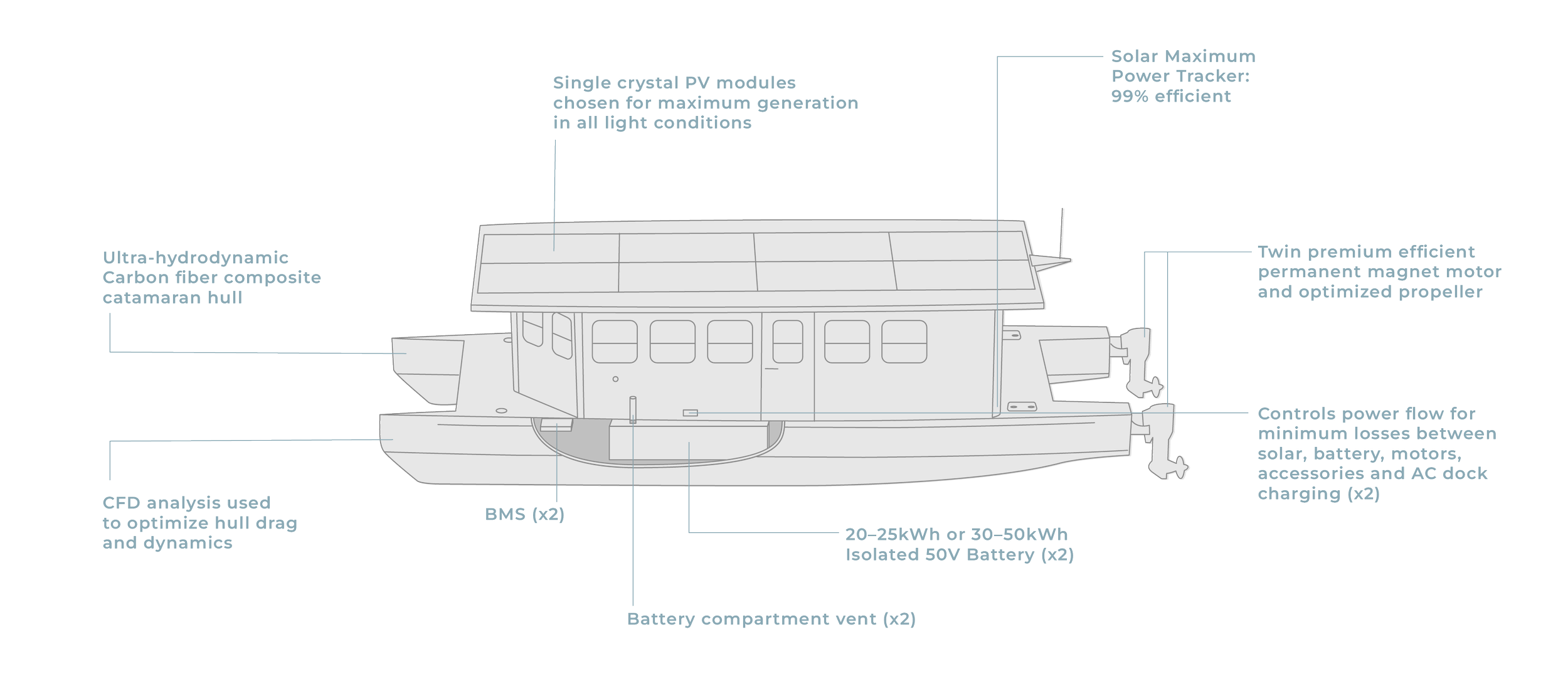 TruSolar® is our system architecture which maximizes solar and minimizes battery. This is due to a deep design priority on vessel efficiency and attention to detail on the efficiency of all systems on board. All the energy comes from the sun. Batteries are only used for overcast, nighttime and emergency operation. Unlike some boats that include solar but are not efficient and include a large battery pack to provide most energy required, our vessels are designed efficiently enough to accomplish any boating activity needed using solar that is generated on board and in some cases augmented by dockside solar and net-zero energy.